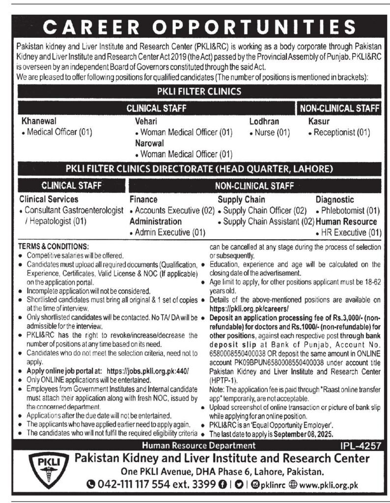 Human Resource Department Pakistan Kidney and Liver Institute and Research Center One PKLI Avenue, DHA Phase 6, Lahore, Pakistan. 042-111 177 554 ext. 3399 | www.pkli.org.pk