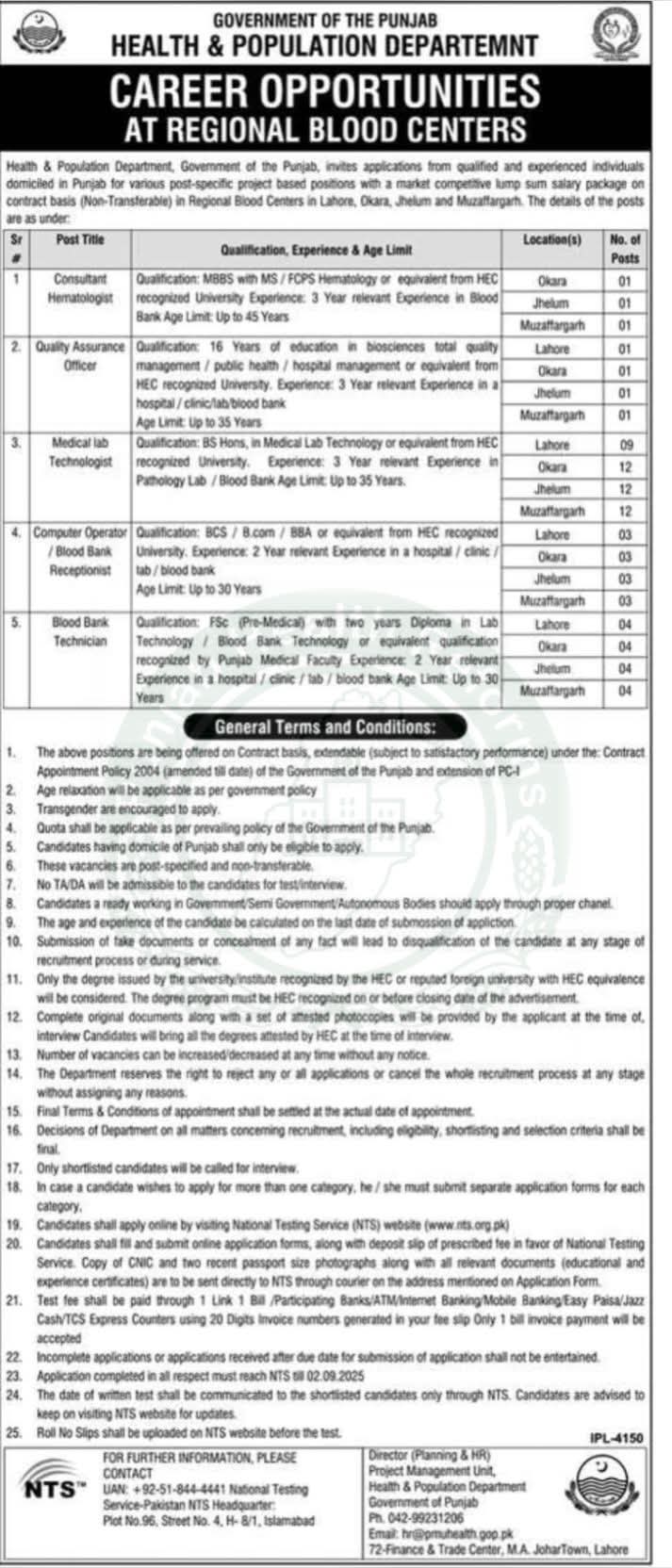 The Health & Population Department is inviting applications for various positions on a contract basis with a competitive salary package at Regional Blood Centers in Lahore, Okara, Jhelum, and Muzaffargarh. Below are the positions available: