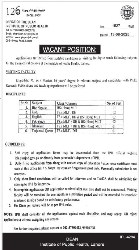 Applications are invited from suitable candidates as visiting faculty to teach the following subjects for the Paramedical courses at the Institute of Public Health, Lahore.
