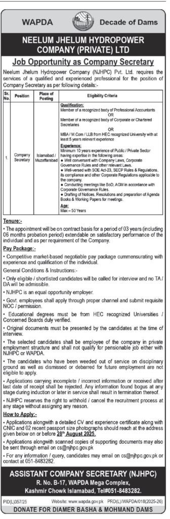 • The selected candidates shall be employee of the company in private employment structure and shall not qualify for pensionable job either with NJHPC or WAPDA.